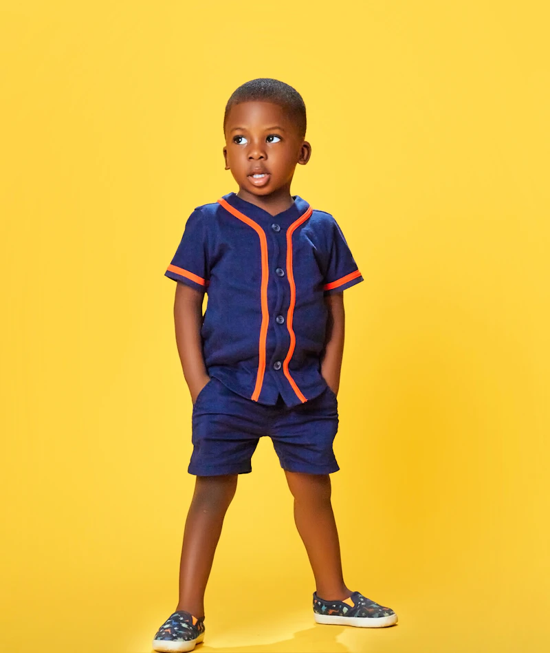 Horizontal striped top with matching navy shorts. A complete look for the little explorer.